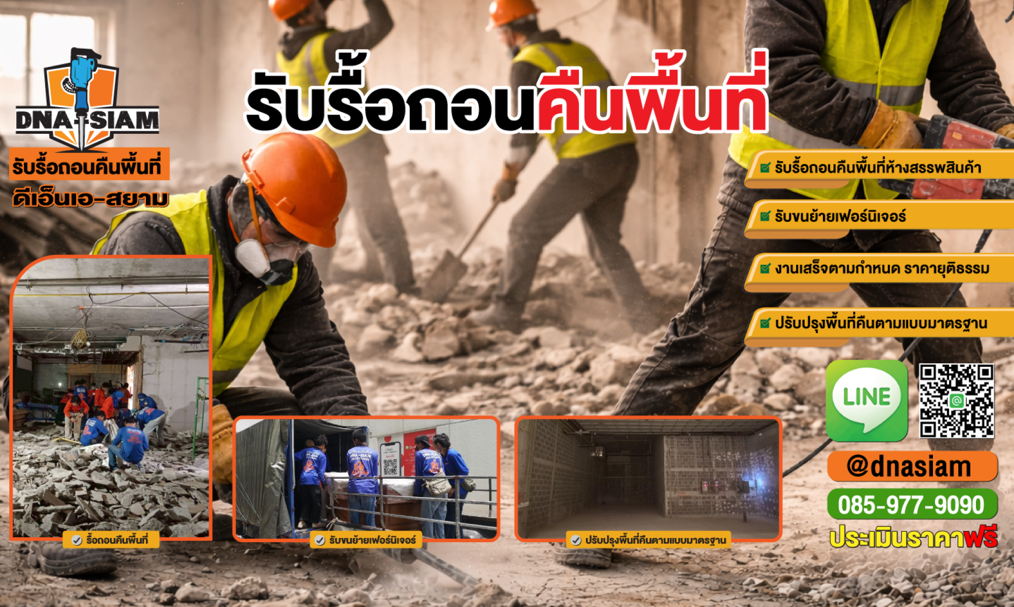 รับรื้อถอนร้านอาหาร รื้อถอนเพื่อคืนพื้นที่ รื้อร้านอาหารหมดสัญญาเช่า บริการรับรื้อถอนร้านอาหารทั้งในเขตกรุงเทพและต่างจังหวัด ในศูนย์การค้า ห้างสรรพสินค้า คอมมูนิตี้มอลล์ ทั่วประเทศ บริการงานแก้ไข Defect ต่างๆเพื่อคืนสภาพเดิม งานระบบไฟฟ้า งานสปริงเกอร์ รวมถึงงานขนย้ายเฟอร์นิเจอร์สำนักงาน เครื่องครัวสแตนด์เลส ทรัพย์สินในร้านขนเก็บเข้าโกดัง รับเป็นตัวแทนส่งมอบคืนพื้นที่กับฝ่ายอาคาร รื้อจบครบในที่เดียว ดีเอ็นเอ-สยาม